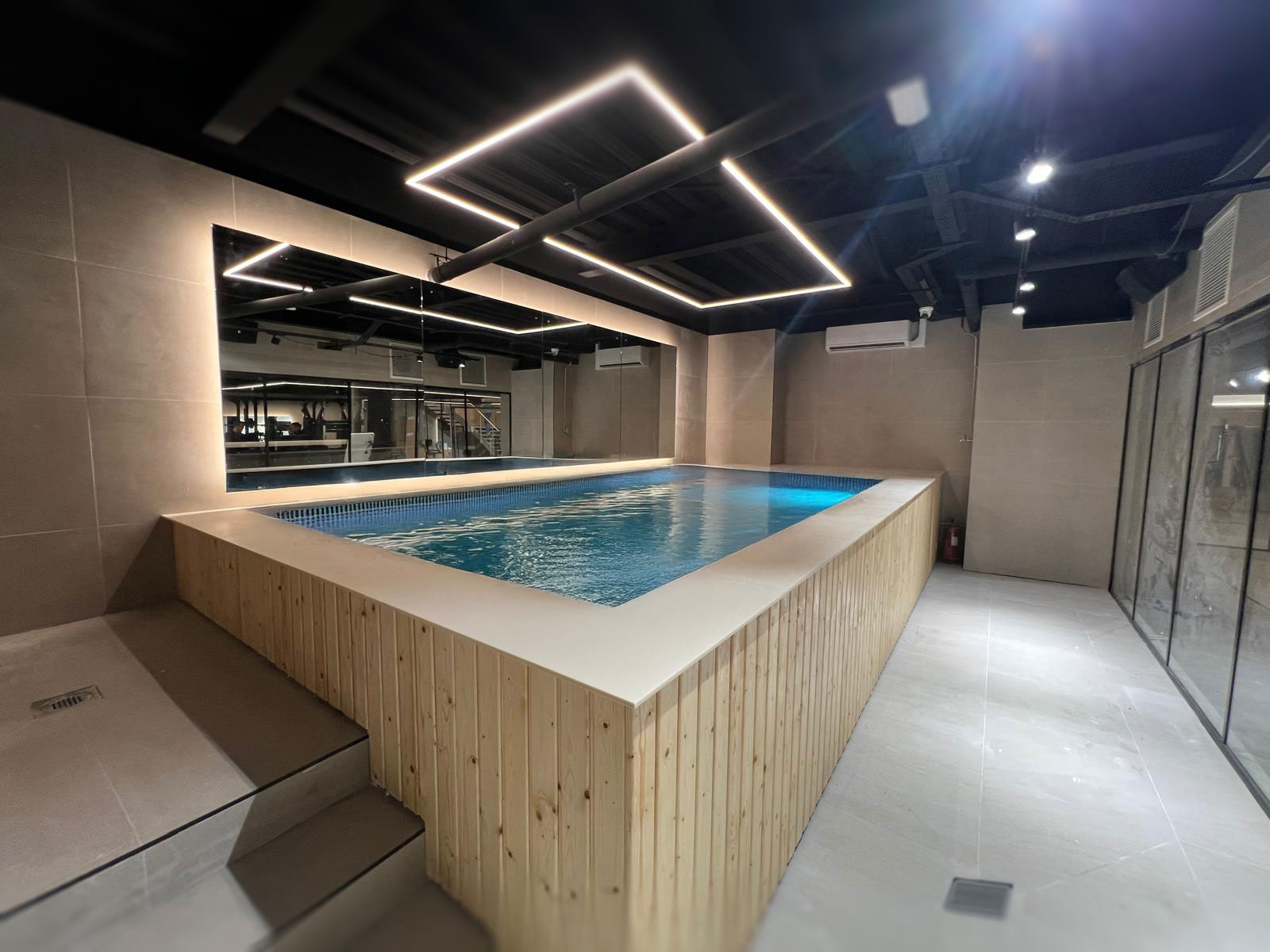 Using the existing drainage infrastructure as a guide, we strategically positioned new bathrooms and service areas before designing the rest of the space around these anchor points. The facility includes an innovative endless pool for running and constant swimming in a compact footprint, as well as multiple infrared saunas (one-person and three-person), a ten-person classic sauna, cold showers, and two ice plunge pools to support a complete recovery experience. Male and female changing areas were equipped with two showers each, while unisex toilets and two red light therapy rooms were integrated along a shared corridor.