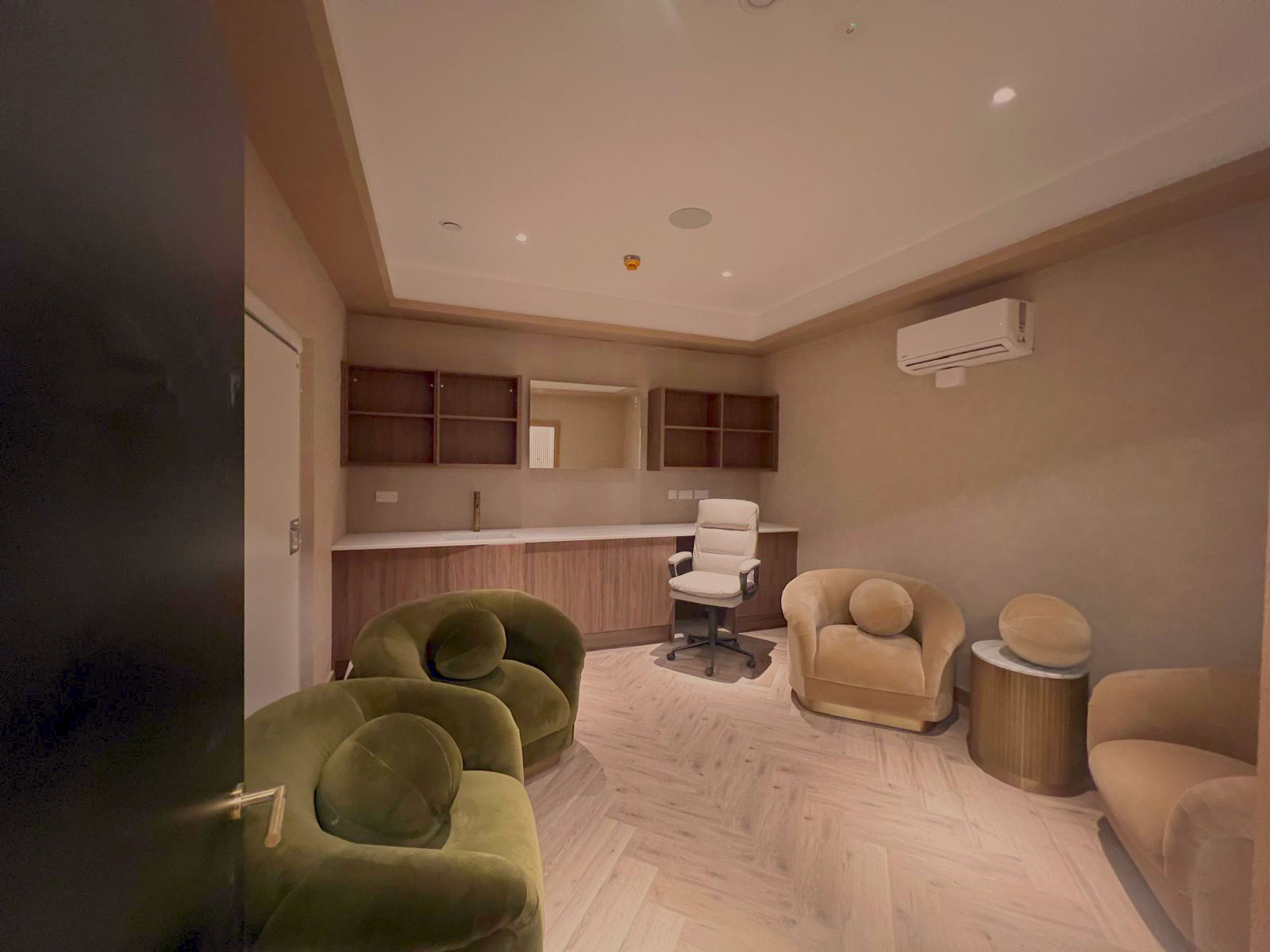 Tailored solid surface counters, banquette seating, lockers, vanity units, and switchable privacy glass ensure both durability and luxury.