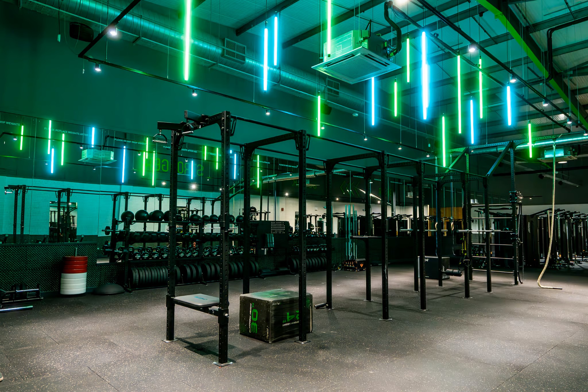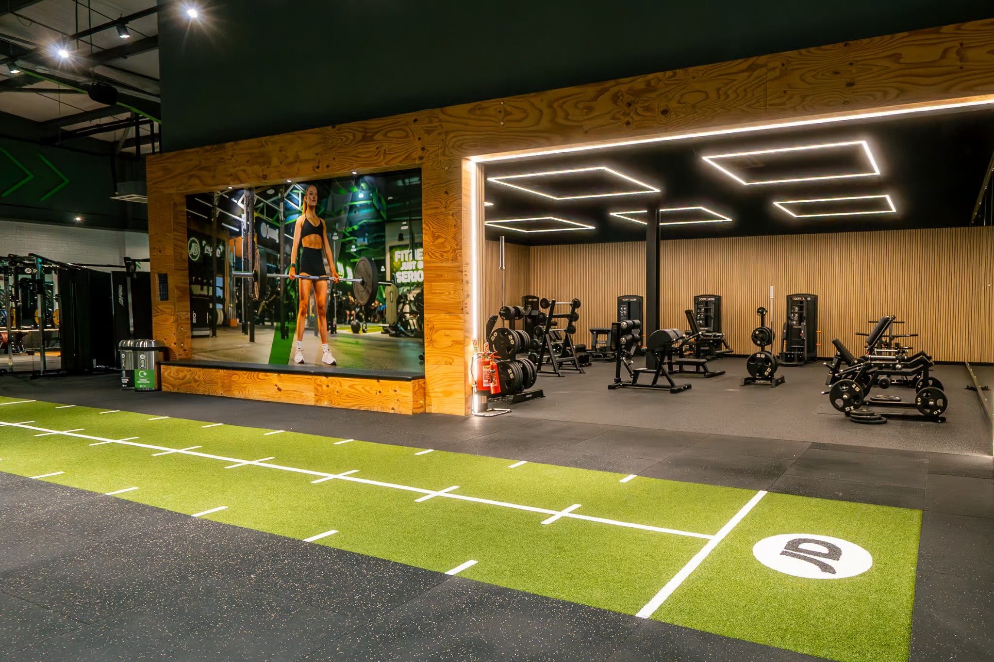 Significant reconfiguration took place within the main gym floor. A new functional training zone was created by relocating the entire free weights section into the former “BURN” studio location. The existing mesh wall that previously enclosed the BURN area was removed, allowing the free weights zone to expand and significantly improving visibility and openness throughout the gym. Feature TRON chevron arrows were installed above the dumbbell areas, angled subtly downward to clearly define the zone without reliance on excessive signage.