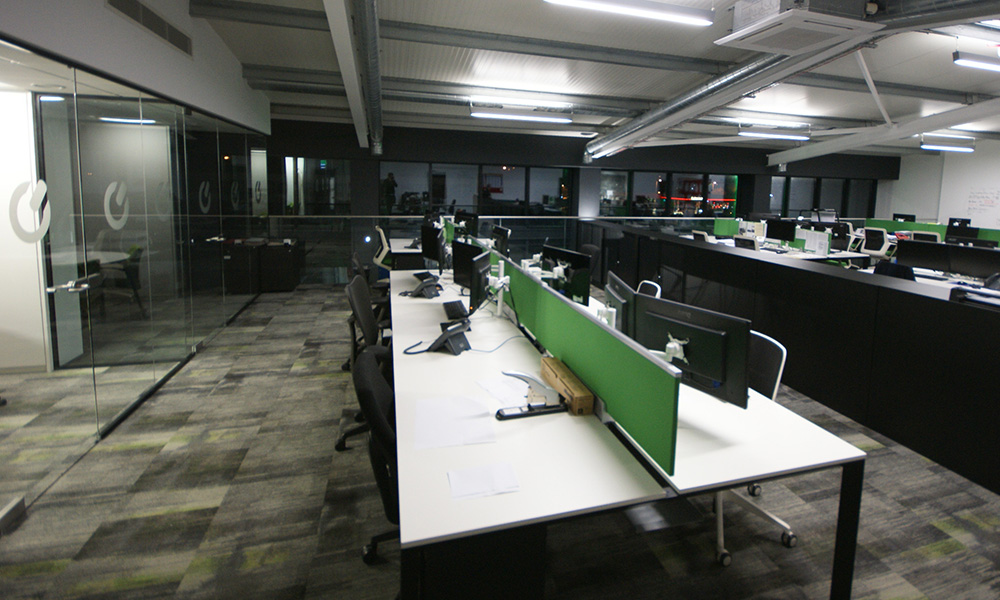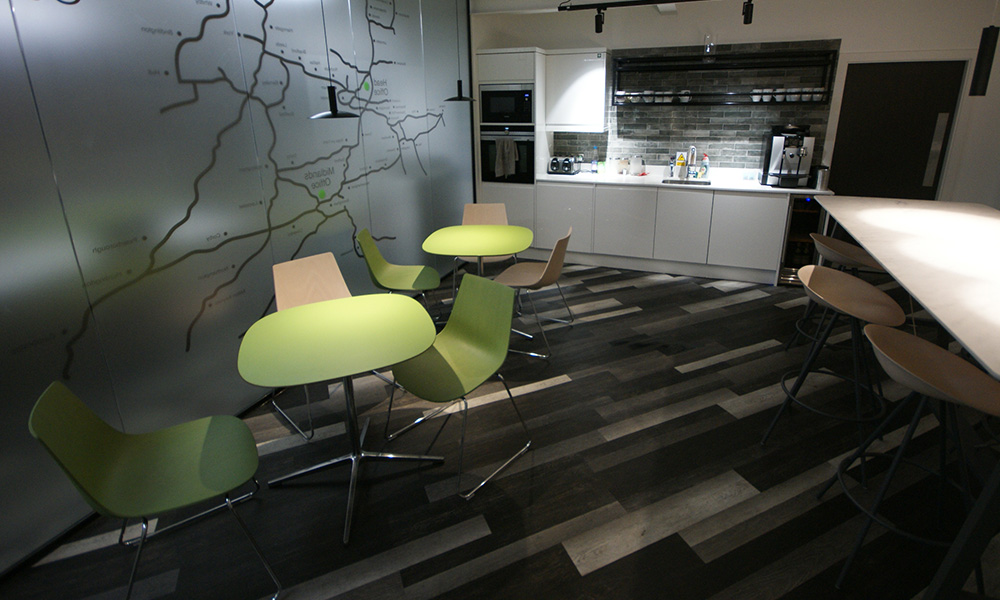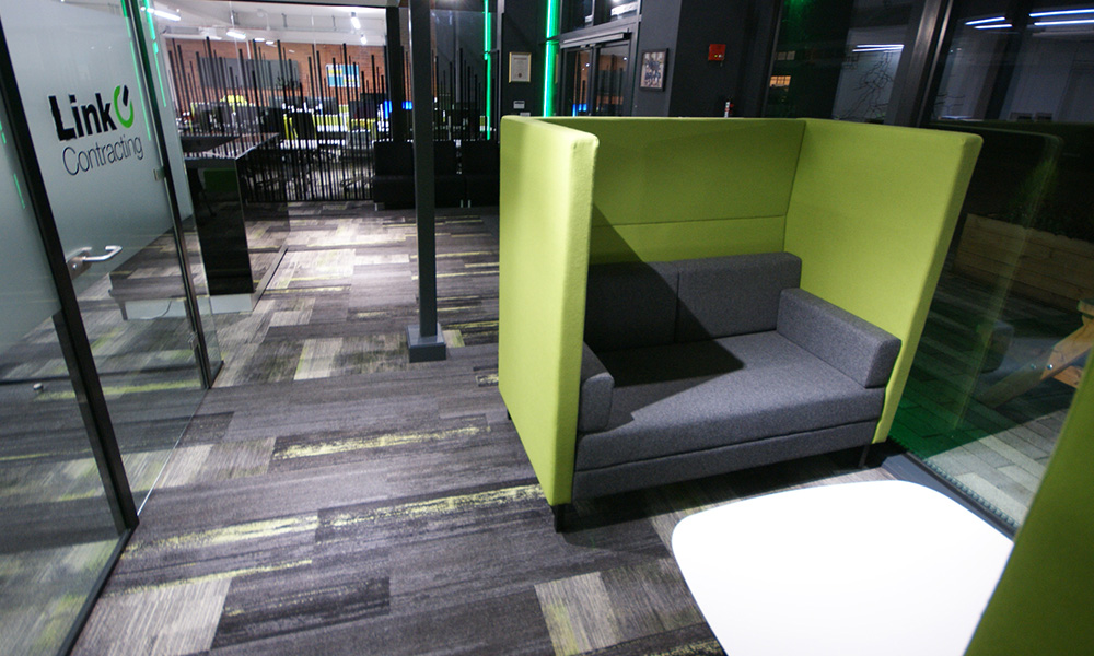 DBI finished the Interior Design and Fit Out at the stunning new Wigan Head Office for Link Contracting. The conversion from the old fruit market building into this fabulous office is a credit to the Link Directors for their vision and the high-quality building works carried out in-house. We have given them a bang on trend “industrial” look with exposed steelwork, raw brick walls, exposed ducting, frameless glass balcony and a sumptuous breakout area. The desking we’ve supplied was a DBI special with raw steelwork and low screens to encourage interaction between staff. Working very closely with the in-house Link M & E department to integrate many elements, suspended mood lighting, funky carpet and fully glazed office complete the look.