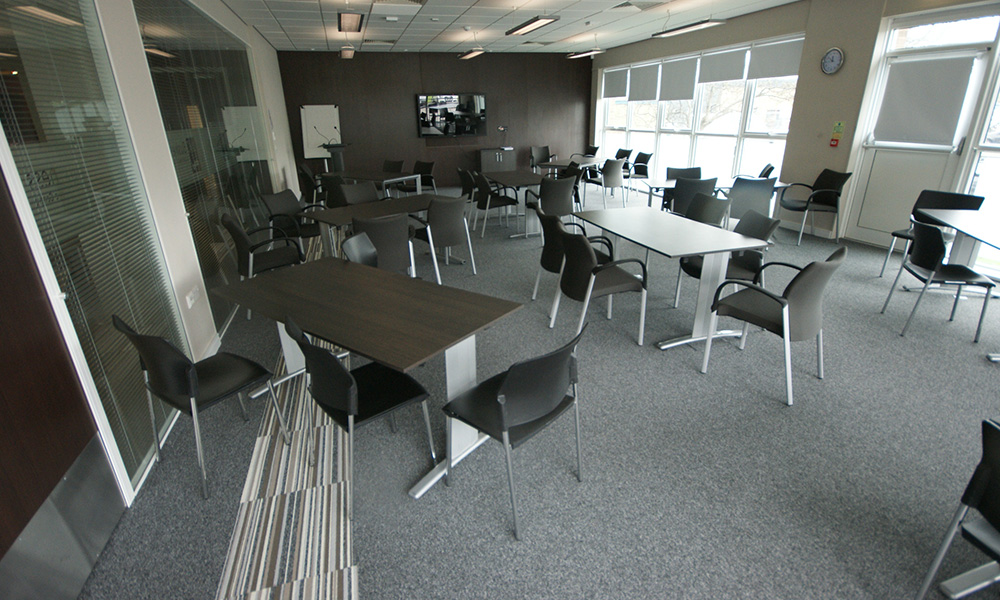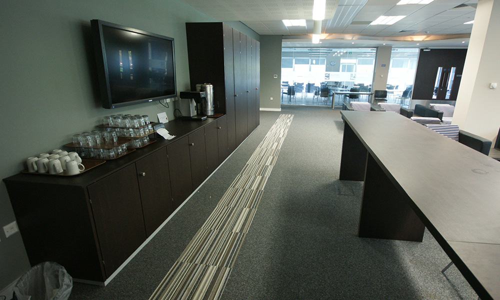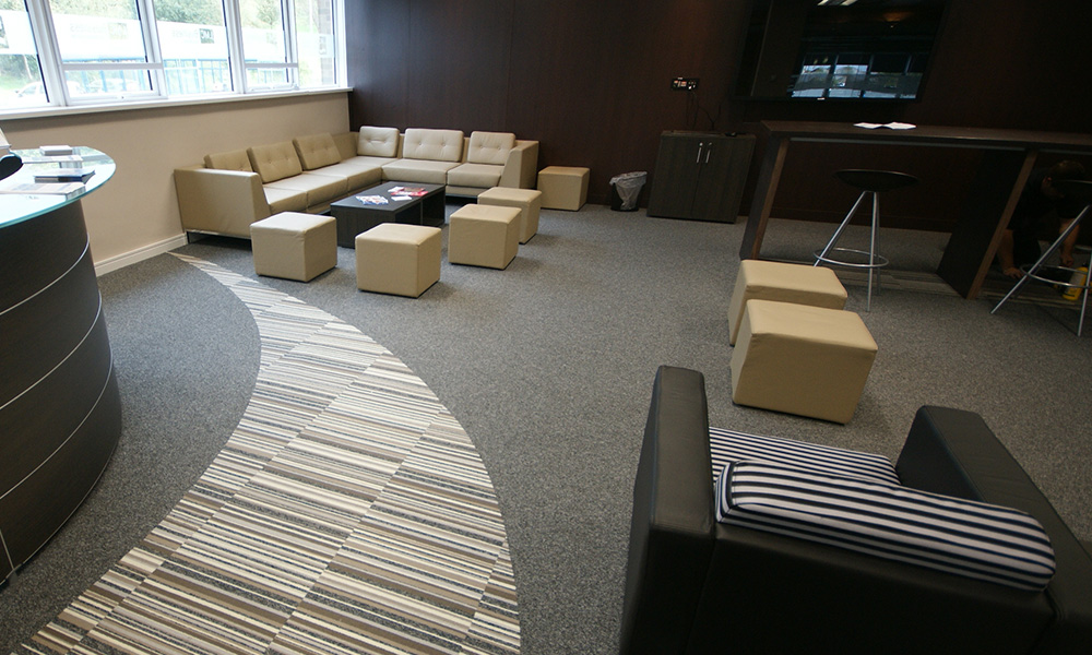 Working alongside leading architects Ellis Williams, we were tasked with creating an upmarket “Business Lounge” on the college campus. This facility was to be for the use of internal college use as well as commerce in the Lancaster and Morecombe area. A dark sophisticated wenge effect was selected for the furniture and coordinated through the bespoke storage and beverage areas as well as the reception desk, doors and wall finishes. Luxurious leather soft seating with feature seat cushions coordinating with the flooring. Multi function tables and chairs added limitless flexibility to the changing rooms too.