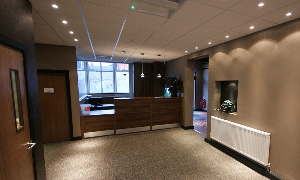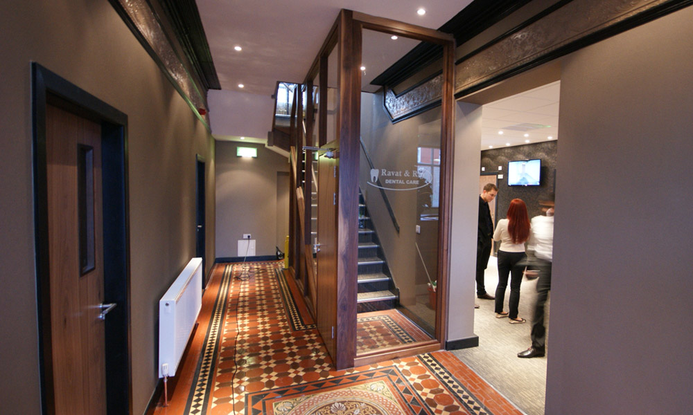 A time warp, dilapidated pub is not always the most obvious site for a stunning dental practice, but we love a challenge at DBI. When long standing customer Ravat and Ray discussed purchasing an old pub in Bolton, we were more than happy to assist. Following in-depth surveys, we produced detailed architectural drawings and elevations of the existing, before creating a stunning new design concept. A complete back to bare brick strip out was required including multiple small buildings works and extensive roof repairs before we could start on the inside. Exposing previously hidden original features was a vital part of this project whilst giving a crisp modern interpretation of them. The Ground floor included a combination of NHS and private waiting areas and surgeries with the 2 upper floors being transformed into a large conference room, administration and directors offices. Stunning decoration and lighting along innovative use of wallstorage systems fully interacted with the contemporary and traditional furnishing to give sumptuous areas as required. A full restoration of the external decorative finishes, new signage and new car parking completed our works.